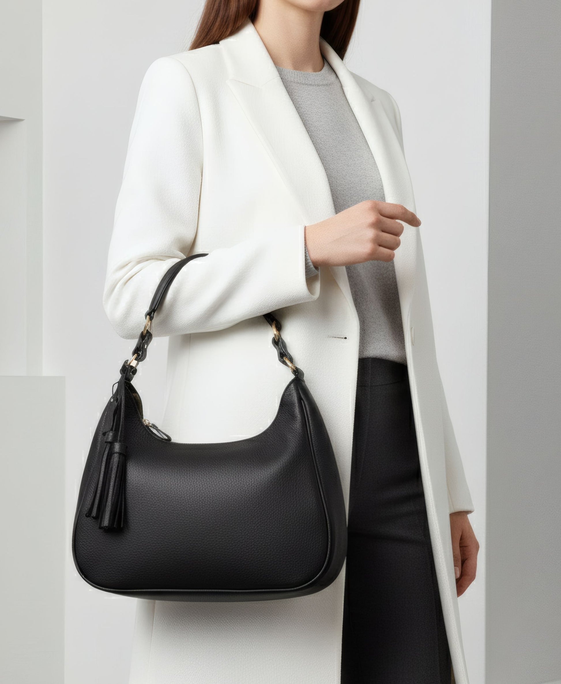 Handcrafted in Mexico, the SIENA Bag blends a soft hobo silhouette with refined details like gold-tone hardware and statement tassels. It’s a sleek, medium-sized shoulder bag designed for everyday wear, office looks and polished city outfits.